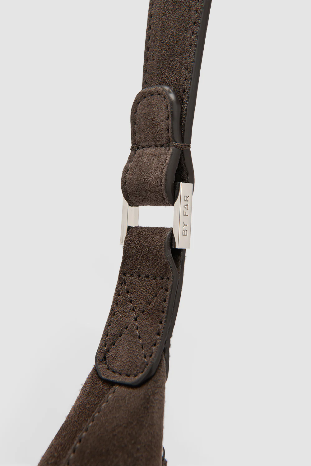 Suede leather shoulder bag with structured silhouette and silver-toned metal hardware with BY FAR branding. Features three inside pockets and black synthetic suede lining. Finished with a zip closure.