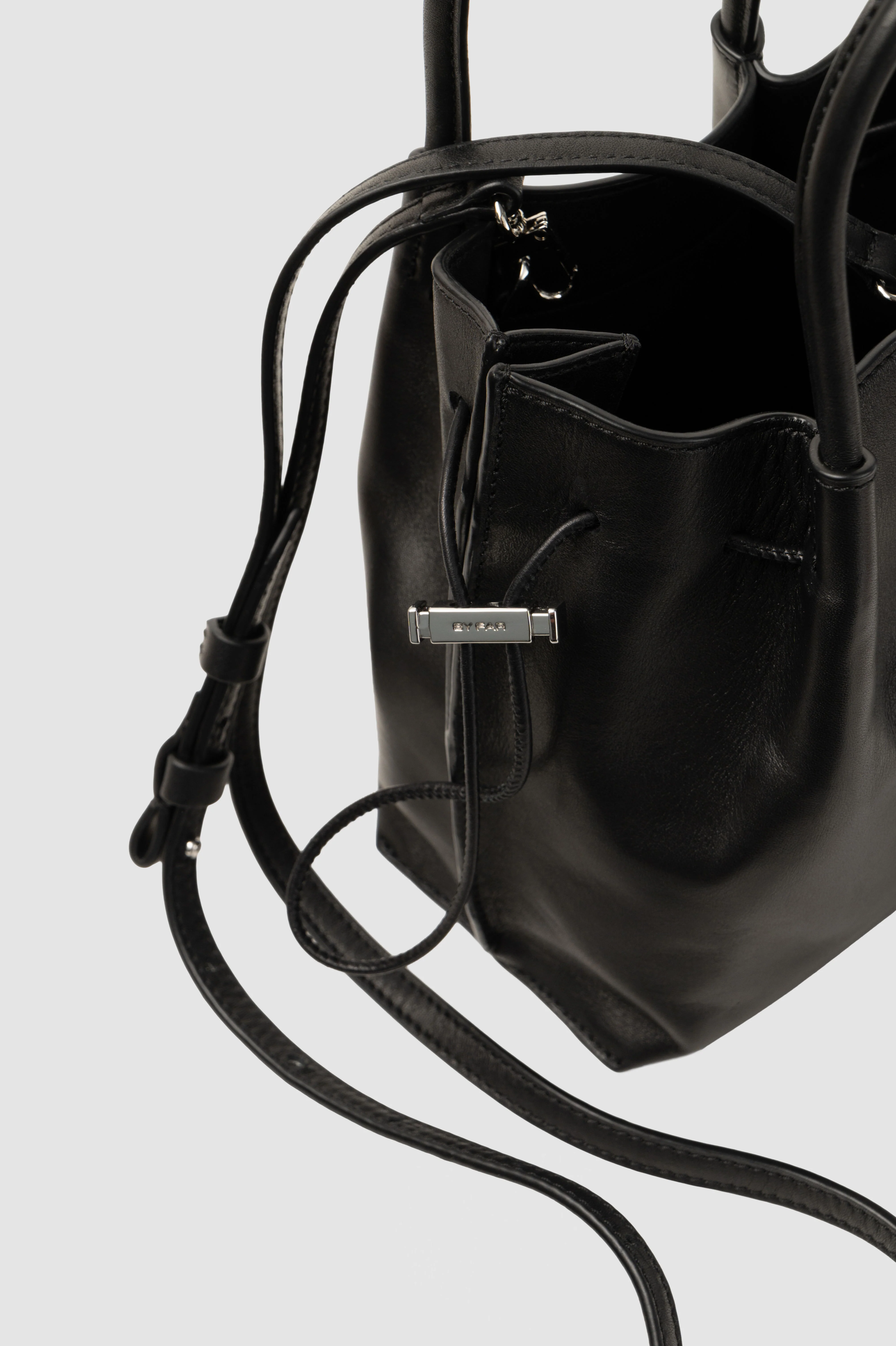 Soft nappa mini bucket bag with a tubular leather top handle, side drawstrings, and detachable crossbody strap. Features branded metal hardware, micro suede lining, a small interior branded leather patch pocket, and external BY FAR branding.