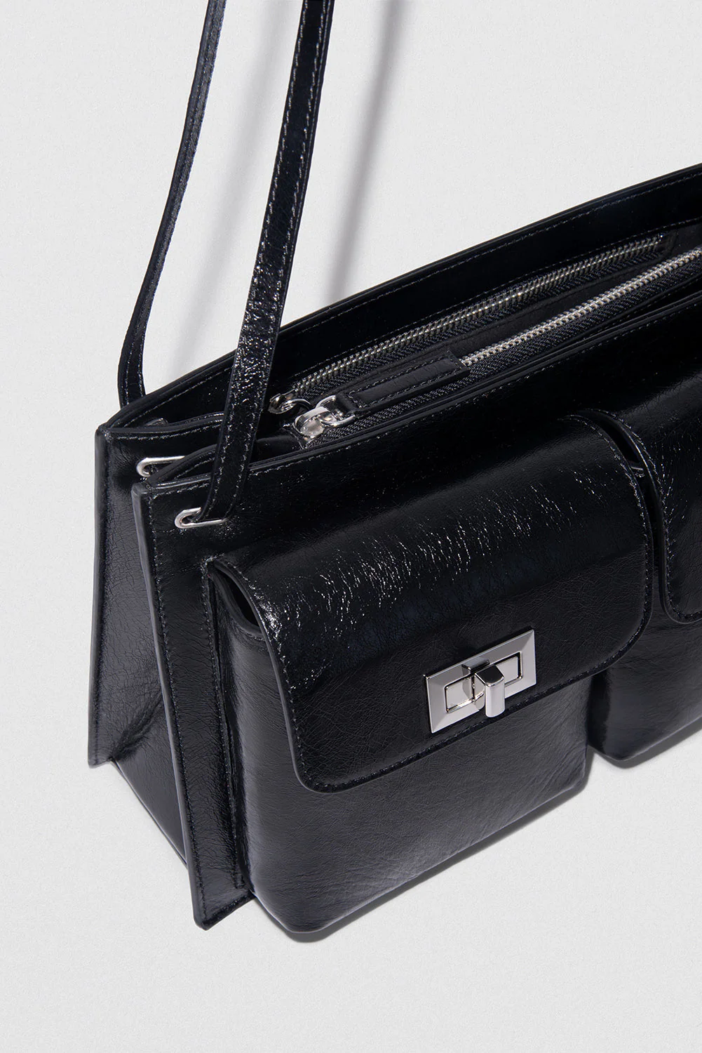 Creased leather shoulder bag with an adjustable strap, zip closure, and two compartments. Features a back slip pocket, synthetic suede lining, and a raised logo patch. Made from LWG-certified leather.