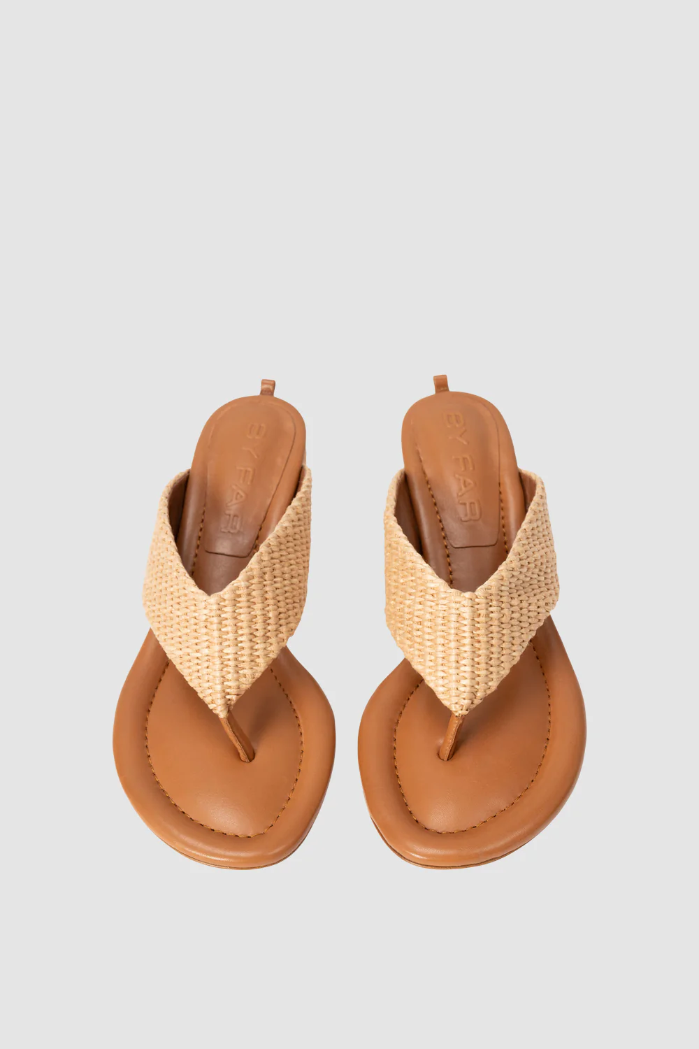 Raffia and leather flip-flop heel sandal with gathered leather straps, round toe, and a 5.5 cm heel. Features a cushioned footbed with topstitching and an ankle bracelet.