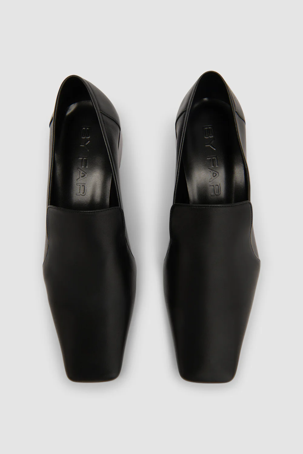 Soft nappa loafer with a glove-like fit, featuring a 3cm stacked leather block heel with a tonal 3mm border. Designed with a square toeshape and finished with a leather sole