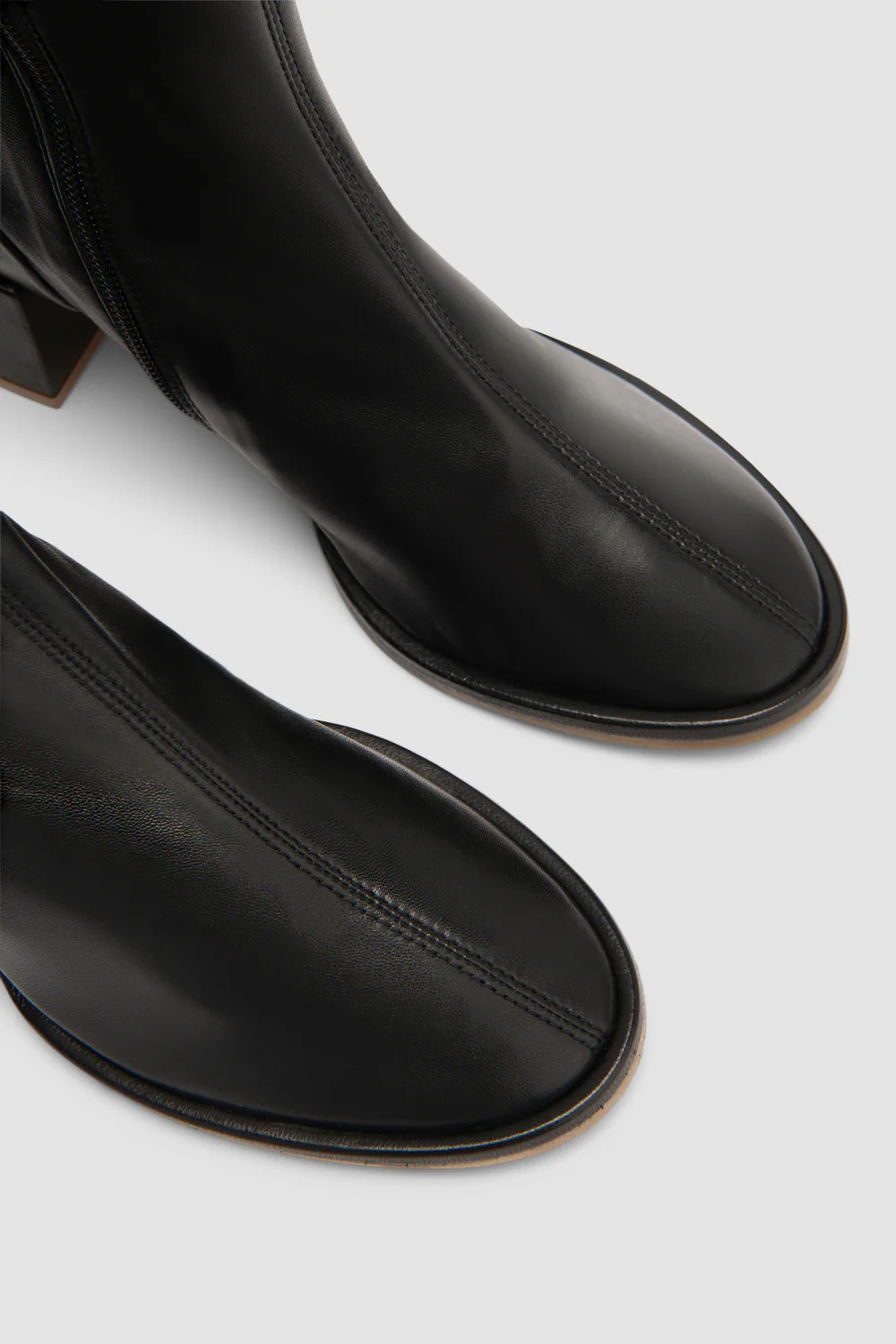 Nappa leather ankle boot with an unlined upper and a glove-like fit, featuring an internal side zip closure and central seam. Finished with a 5cm leather-covered block heel with a 3mm border, round toeshape, and a crepe rubber and leather sole.