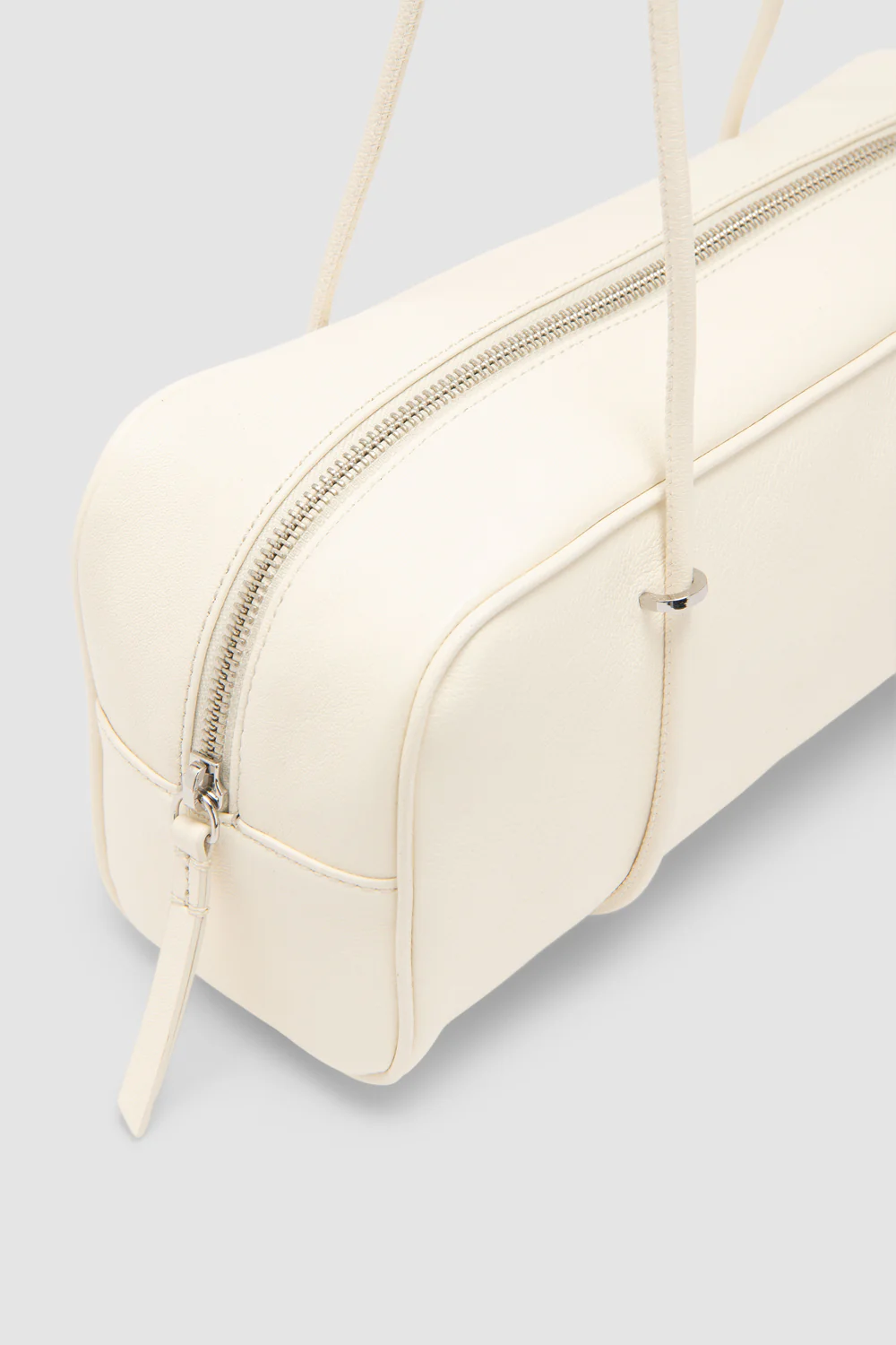 Washed leather baguette bag with oversized soft construction and tubular leather shoulder straps. Features a zip closure and a spacious interior compartment, complemented by a small branded leather patch pocket (credit card size). Finished with micro suede lining.