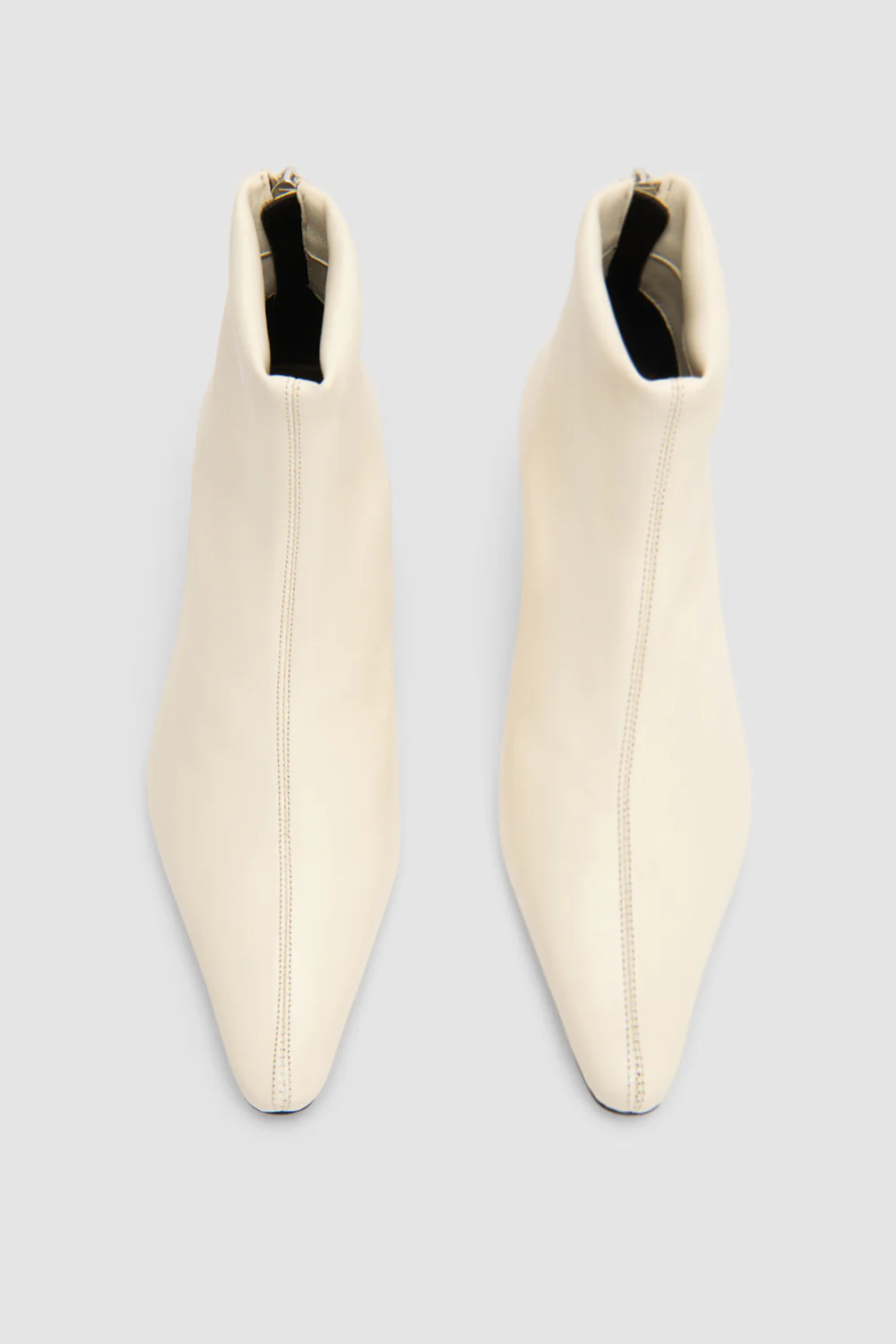 Ankle boot in stretch nappa leather with a back zip closure and central seam. Features a 5cm leather-covered kitten heel, almond toe, and a smooth leather sole.