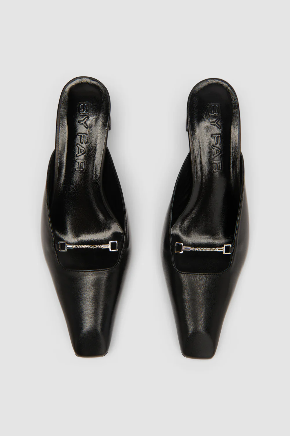 Nappa leather mule with a sculpted 5.5cm leather-covered block heel, low square topline, and square toeshape. Finished with a chain detail and a leather sole.