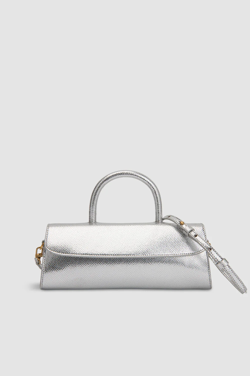 Silver disco mini top handle bag with a structured look, brushed gold hardware, and a detachable, adjustable crossbody strap. Includes micro suede lining and a small branded leather patch pocket.