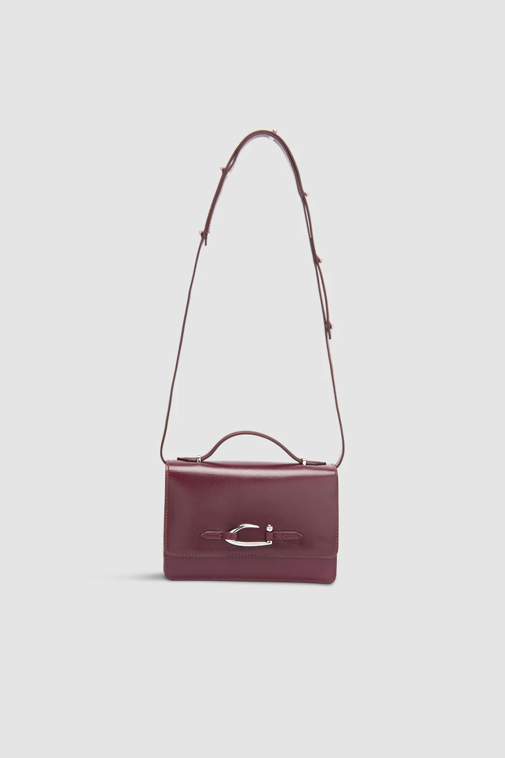 Creased leather structured crossbody bag with an adjustable, removable leather strap and top handle for versatile wear. Finished with a custom metal buckle detail, matching hardware, multiple interior compartments and micro suede lining.