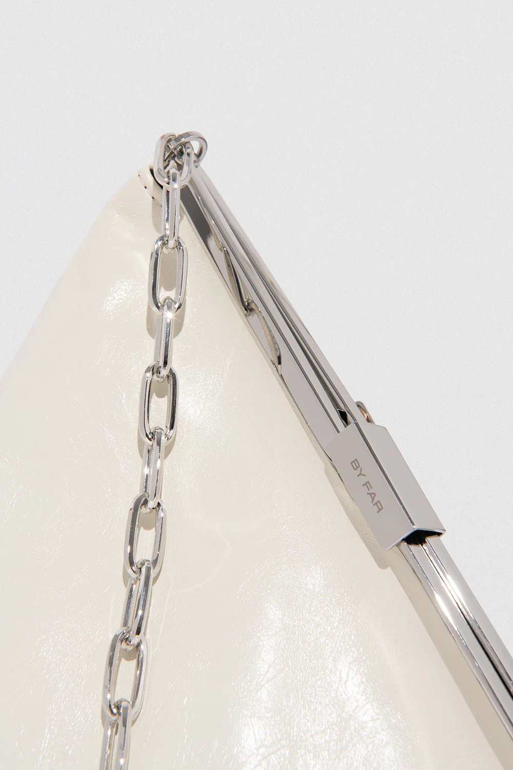 Creased leather top-handle bag with a pyramid construction and a detachable chain strap for versatile wear. Features a silver-toned folding frame, clasp fastening with BY FAR logo, inside zip pocket, and synthetic suede lining. Made from LWG certified leather.