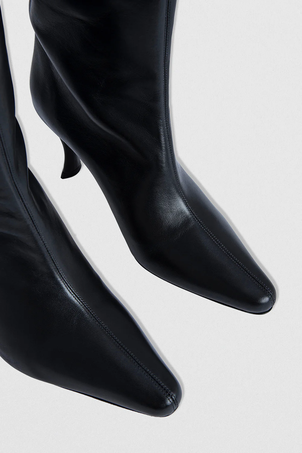 Smooth calf leather knee-high boots with pull-on design, featuring angular 8cm leather-covered heel and an almond toe.